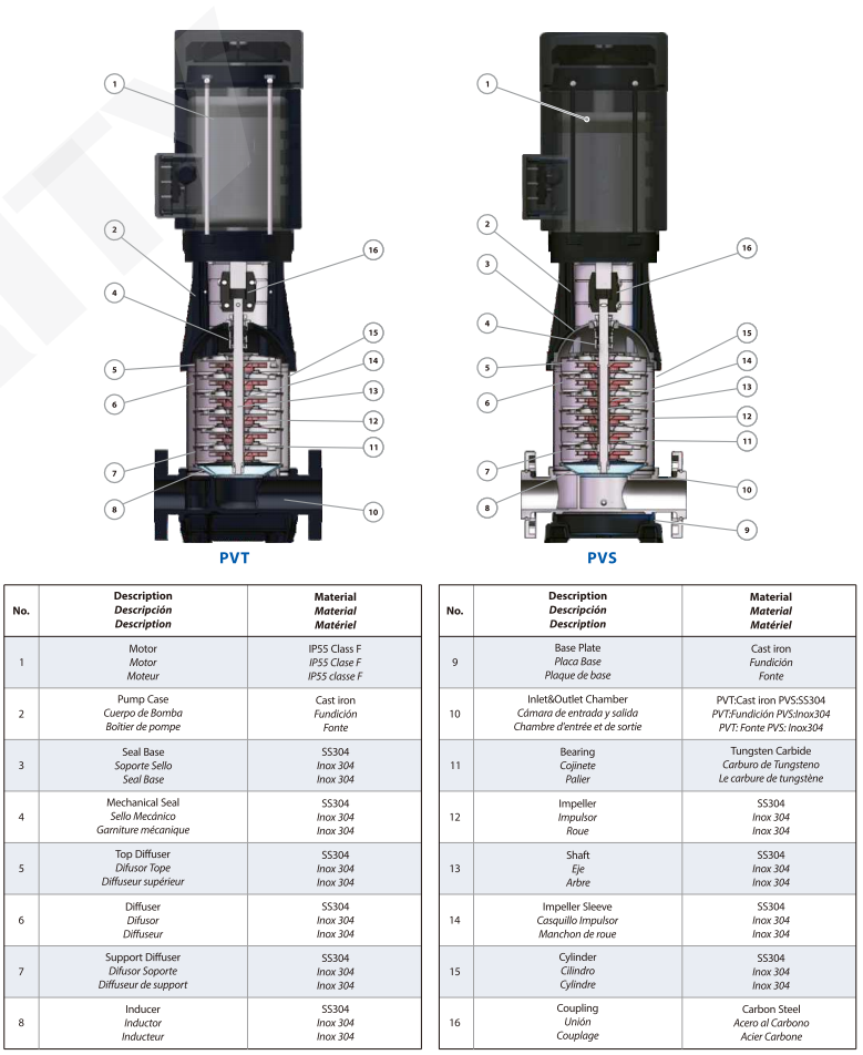 To enhance durability and reliability,Purity PVS multi stage centrifugal pumps are equipped with a cartridge-type mechanical seal and integrated impeller structure. All key components are pre-assembled into a single unit, eliminating axial movement during operation. This design effectively prevents wear on the shaft and other internal parts, ensuring long-lasting performance while reducing maintenance frequency.